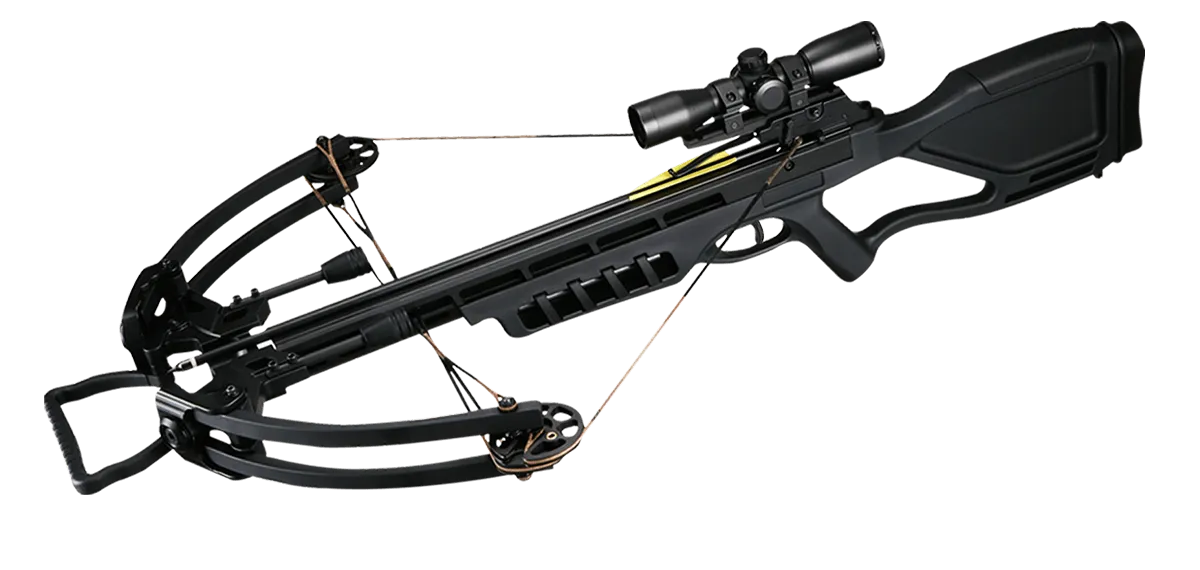 В комплект входят: оптический прицел 4х32, с подсветкой, подствольный колчан, 4 алюминиевые стрелы, веревка для взведения, воск, плечевой ремень