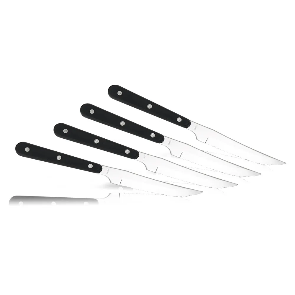 Поставляются кухонные ножи для стейков как поштучно, так и в наборах из нескольких одинаковых предметов для персональной сервировки. Стейковые японские ножи обычно изготовлены из нержавеющей стали, с прямыми заостренными кверху лезвиями длиной 11-15 см, имеют двустороннюю заточку с прямой или серрейторной кромкой.