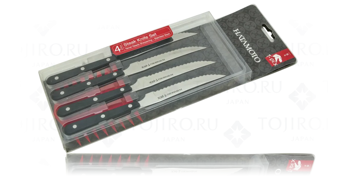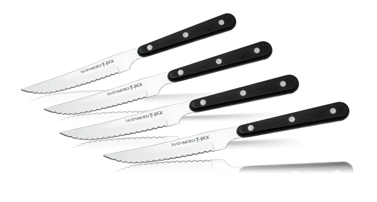 Набор Ножей Hatamoto для Стейков отличное решение, если вы любите стейки! Данные ножи не требовательны к уходу, благодаря чему нарезку можно производить не только на деревянной доске, но и на тарелке или металлической поверхности – стейковые ножи совершенно не пострадают от таких действий.
