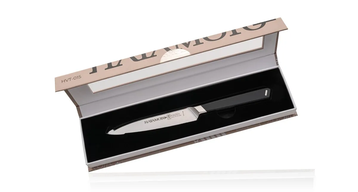 кухонный нож серии Kaizen от Hatamoto HVT-015 идеальный инструмент для кухни, столовой или ресторана. Изготовленный из японской стали AUS-8 с финишной заточкой 8000 грит с ручкой из полипропилена, нож обеспечивает легкую, быструю и аккуратную подготовку продуктов к готовке.