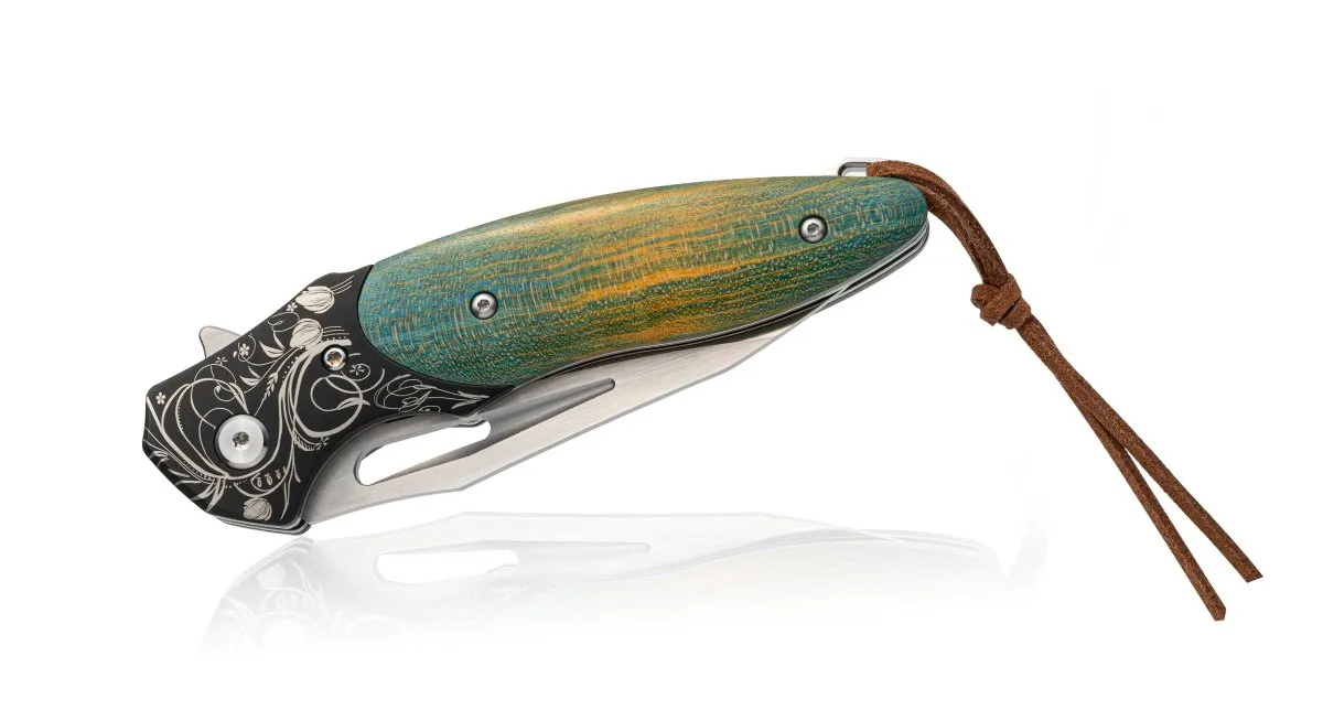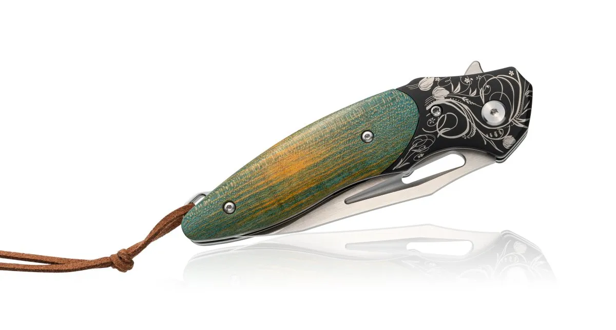 Рукоять выполнена из стабилизированной древесины — прочного и влагостойкого материала с уникальной природной текстурой. Она не только надёжно лежит в руке, но и придаёт ножу тёплый, живой характер.