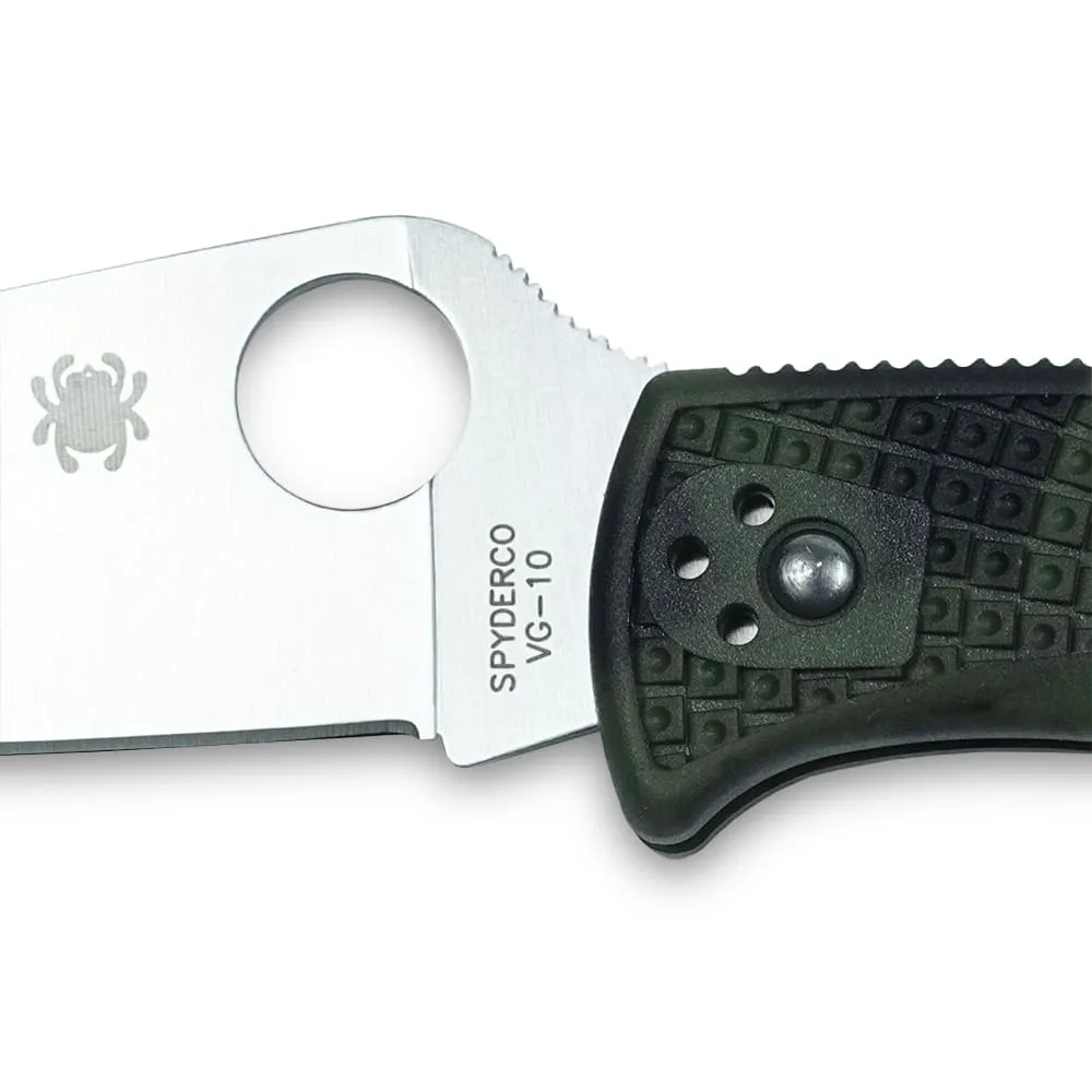 Рукоять из FRN с фирменной текстурой Spyderco обеспечивает надёжный хват даже во влажных условиях, а надёжный замок back lock отвечает за безопасность при работе. Фирменное отверстие SpyderHole™ позволяет быстро открывать нож одной рукой, а многопозиционная клипса делает ношение удобным для правшей и левшей.
