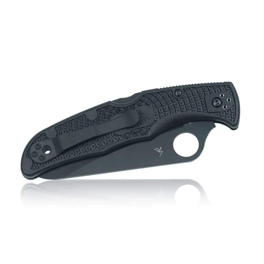 Нож оснащён надёжным back lock, текстурированной рукоятью FRN для уверенного хвата мокрыми руками и фирменным отверстием Spyderco для быстрого открывания. Многопозиционная клипса позволяет настроить ношение под правшу/левшу и предпочитаемую ориентацию.